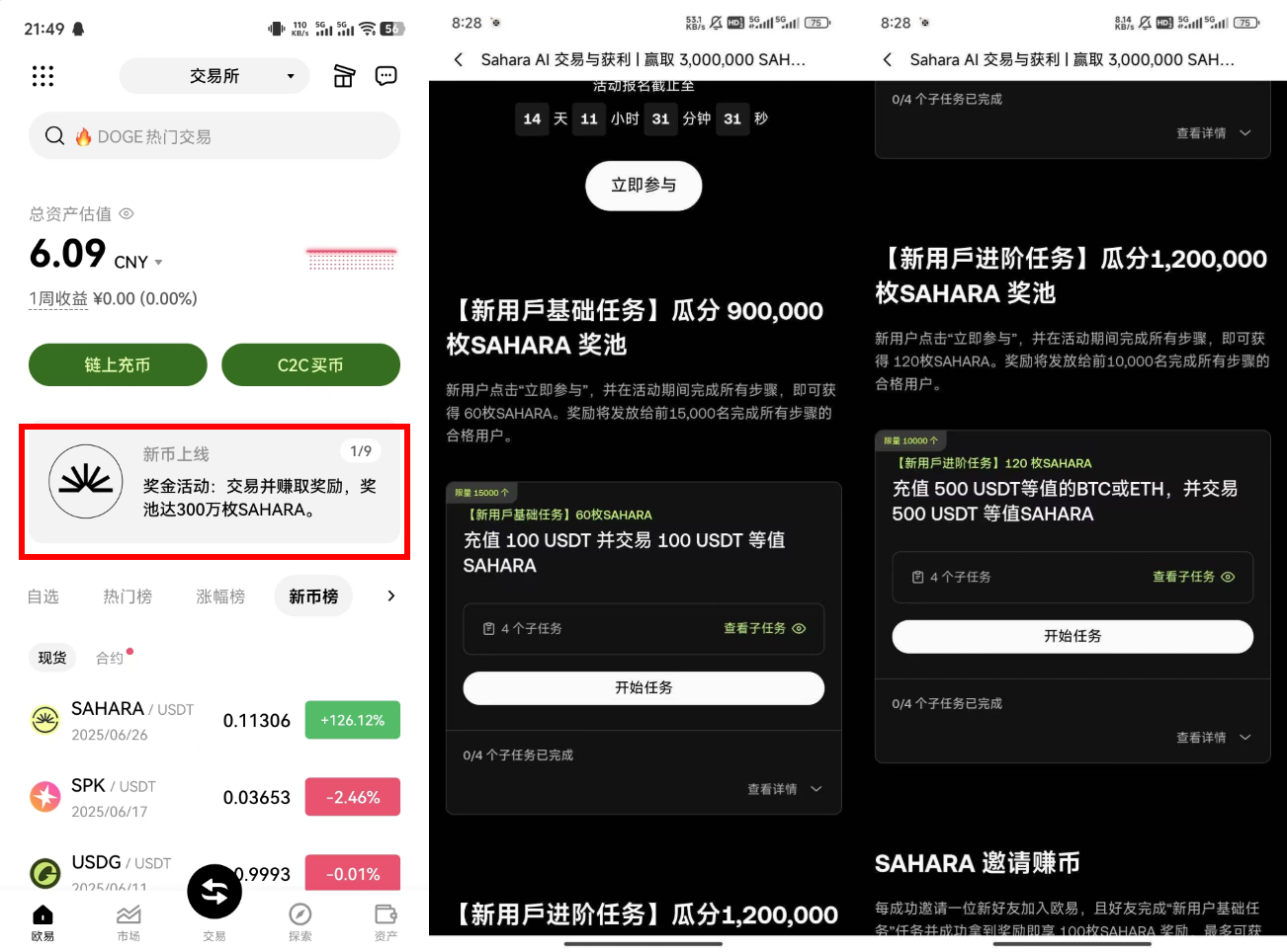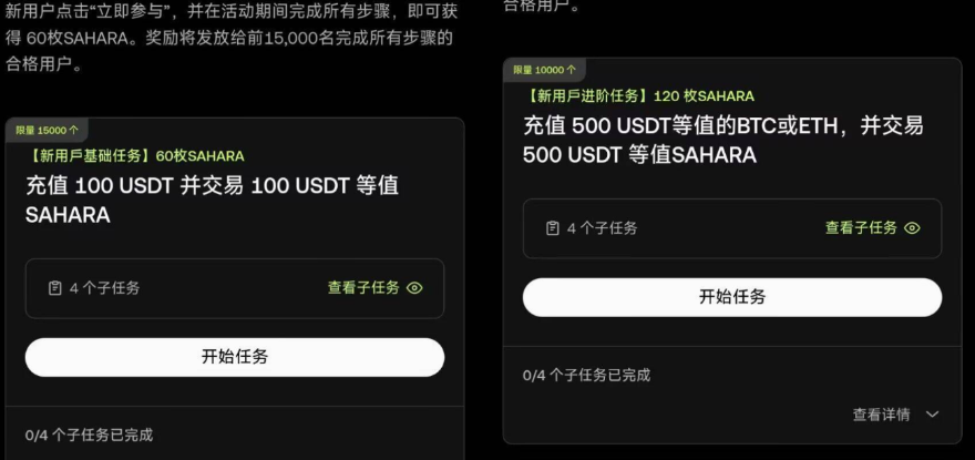 ## 注册链接 ➡[**欧易注册**](https://www.okx.com/zh-hans/campaigns/sahara-trade-and-earn?channelId=4011560)⬅ **注册实名后下载app登陆报名活动即可** ## 活动流程 #### 1.入口 > > #### 2.流程 >d **总流程** > > 从币安把ETH充值到欧易,然后去现货里面卖掉,卖完之后再刷500u的RESOLV现货交易量,接着把500u放在欧易里面三天不要提现走,三天后再去领取奖励就行 >i  >* 去**币安**或者**其他平台**买**505u的ETH**,充到**欧易**上(一定要多买5u到10u,他需要完成任务后,余额保持在500u以上) >i >* **币安提币**跟**欧易充值网络**选择这个**Optimism**(两个平台的网络都得选择这个,别选错了,充错到账不了 ) >  >i >* 到账之后**把eth卖了**,换成u,然后去刷500u的**RESOLV交易量**(==买入300再卖出300就有600交易量了==)